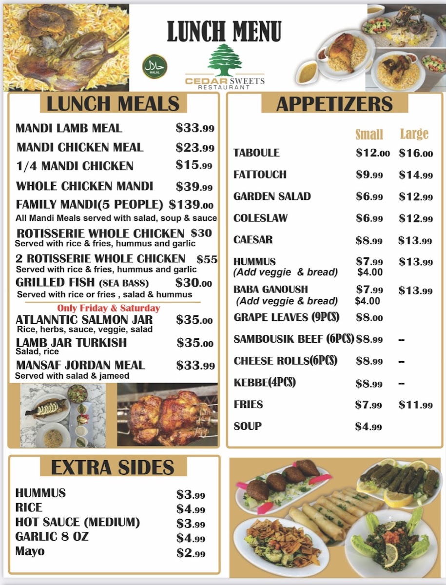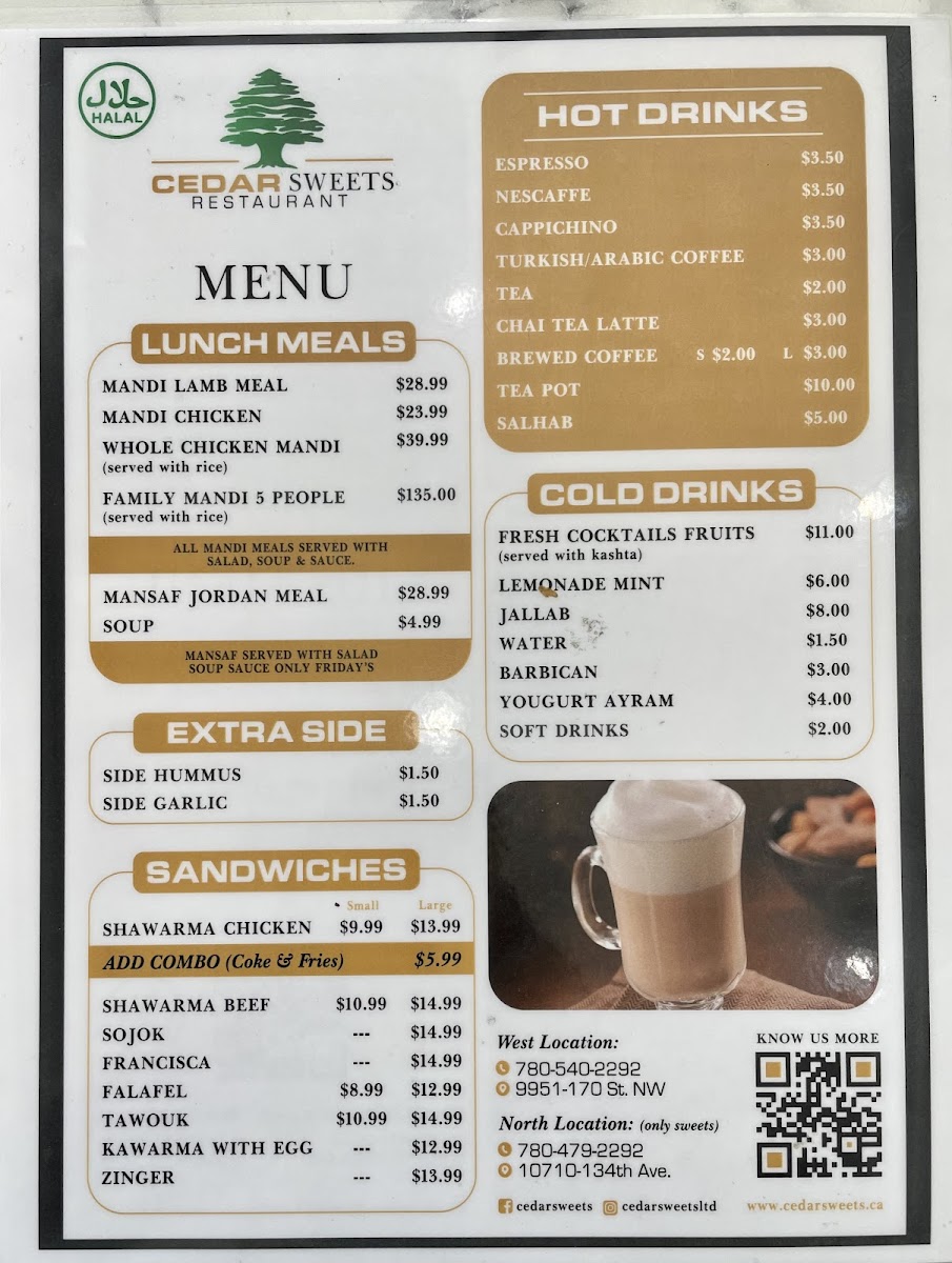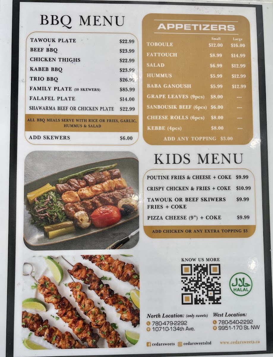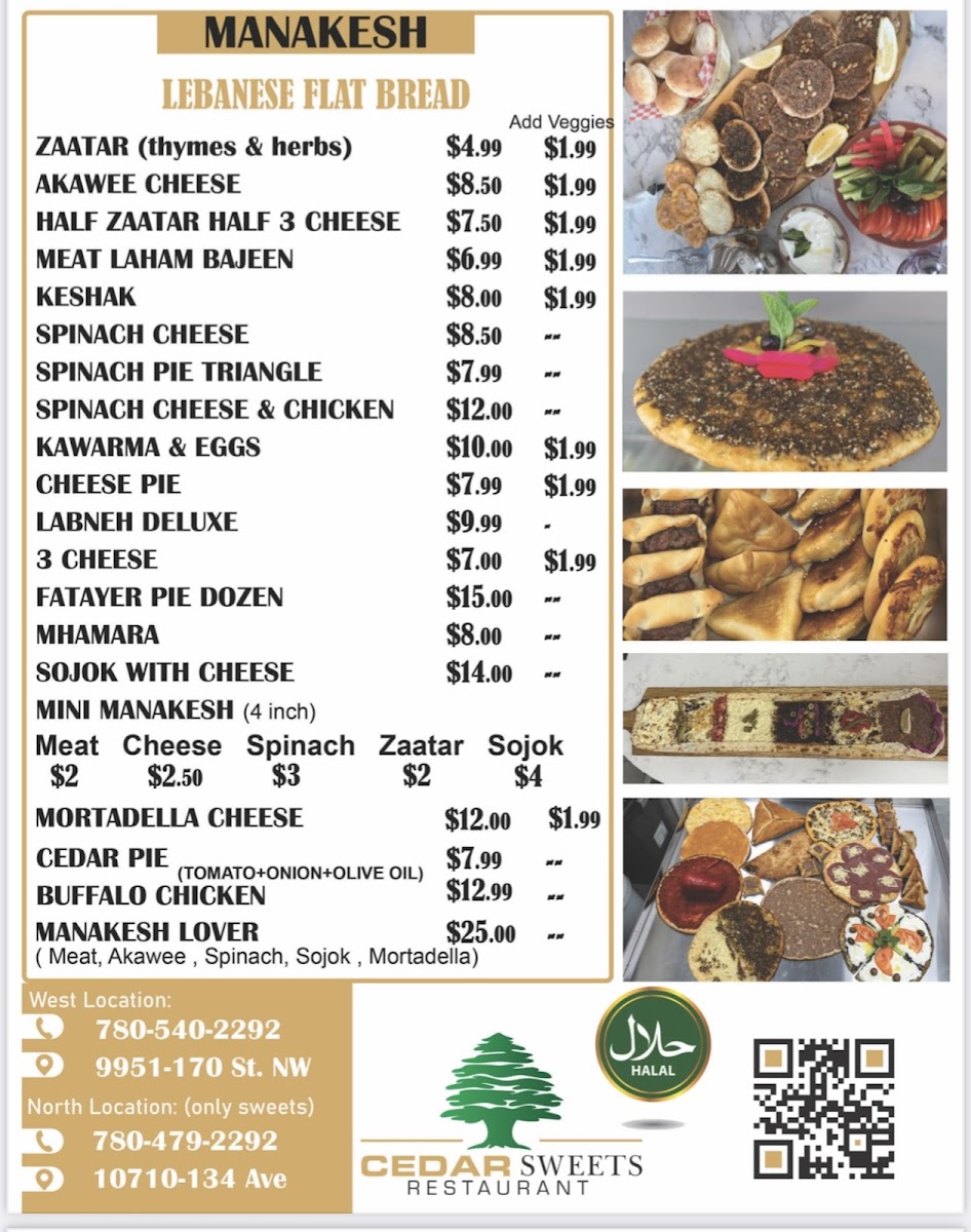 Welcome to Cedar Sweets Restaurant and Catering, a hidden gem located at 9951 170 St NW, Edmonton, AB T5P 4R5. If you're craving authentic Middle Eastern cuisine, this is the place to be. With a diverse menu that features sumptuous breakfast options like Manakesh and a lavish lunch spread including Mandi, Cedar Sweets is a culinary adventure waiting to unfold.